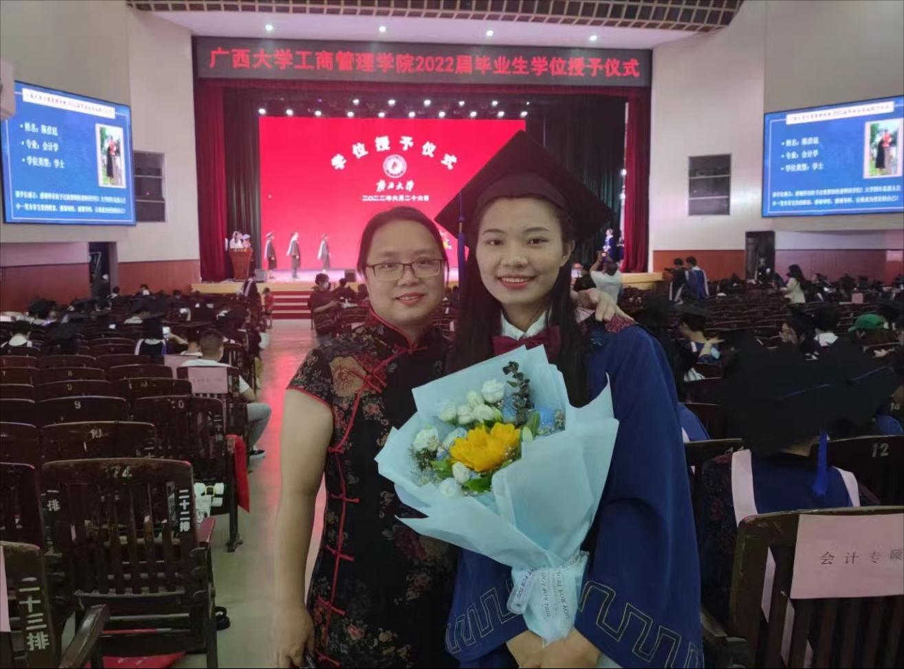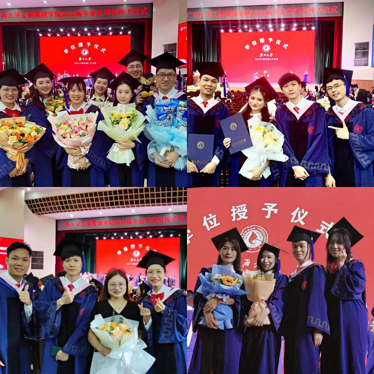 2022年6月26日,广西大学工商管理学院在学校大礼堂为2022届755人毕业生(其中研究生485人,本科生270人)举行庄严而隆重的毕业典礼暨学位授予仪式。院党委书记罗诚,院长朱帮助,院党委副书记黄晋,副院长朱少英、刘民坤、廖东红,教师代表叶映、韦铁、郭峦、唐妤、梁世昌出席仪式。仪式由院党委副书记黄晋主持。