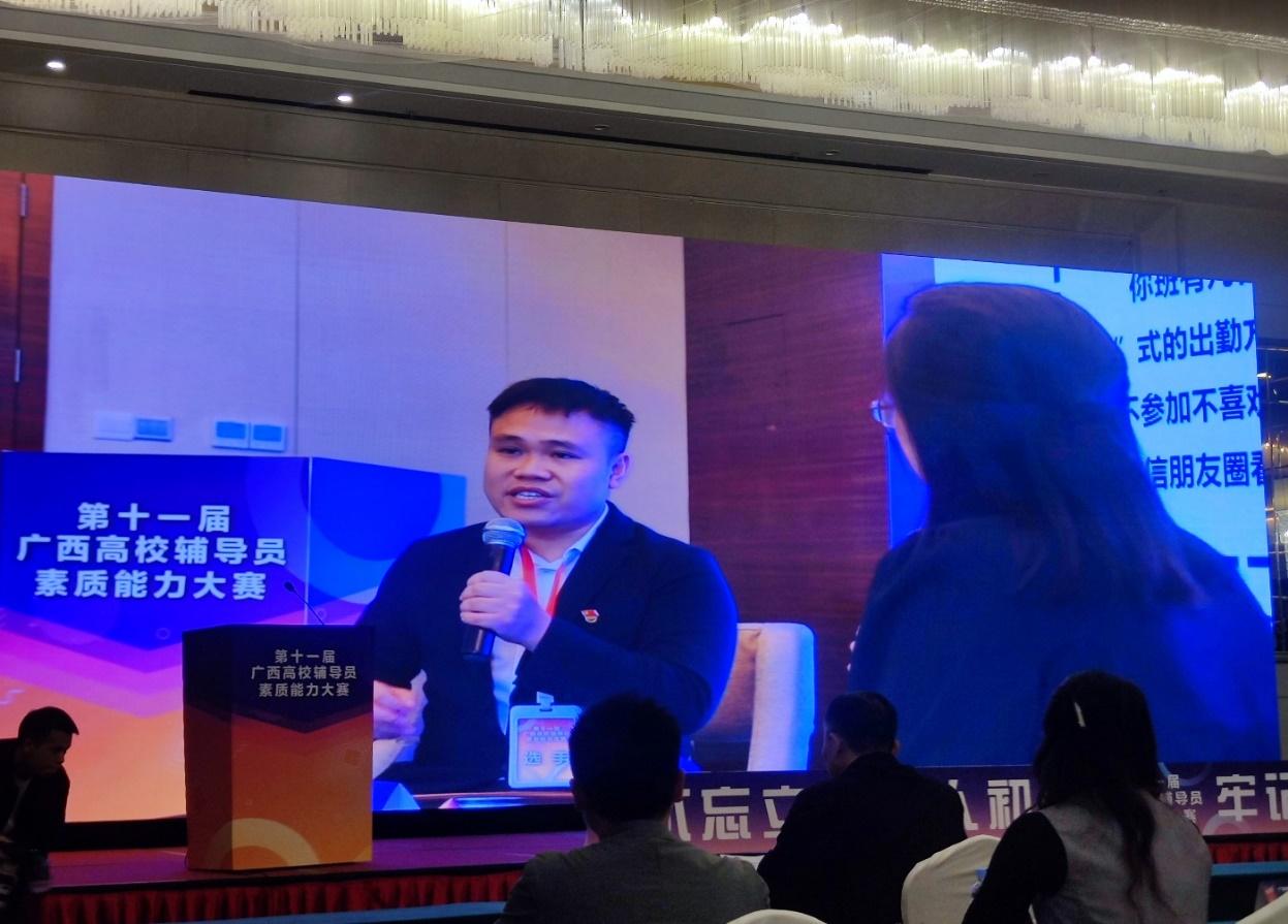 5月12至14日,由自治区教育厅主办,教育部高校思想政治工作队伍培训研修中心(广西师范大学)承办的第十一届广西高校辅导员素质能力大赛在桂林举办,共有来自全区各高校的84名专职辅导员参赛。经过三天激烈角逐,我院辅导员岑汉成老师以总分第四名获得大赛一等奖,并在“基础知识”、“谈心谈话”两个比赛环节中获“最佳表现奖”。