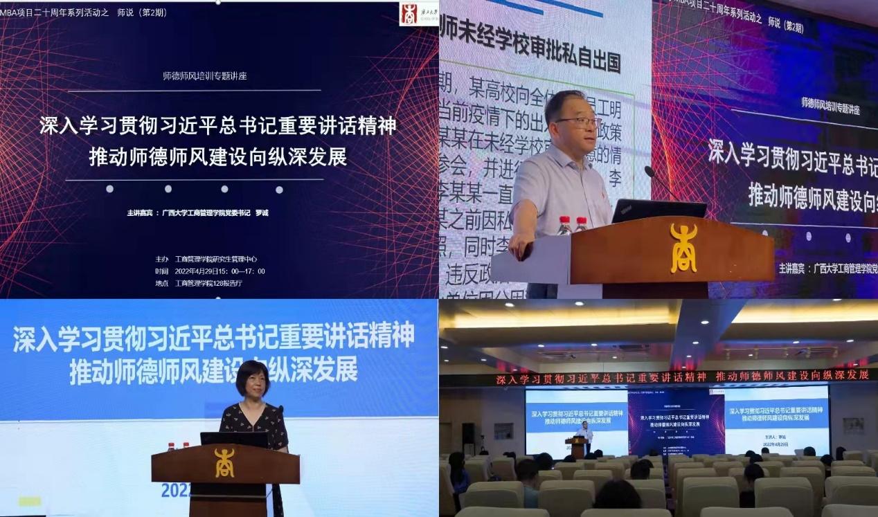 为深入学习贯彻习近平总书记在中国人民大学考察时的重要讲话精神,深入学习贯彻习近平总书记关于教师特别是师德师风的重要论述,深入学习贯彻中央、教育部、自治区和学校颁布的高校教师队伍建设、师德师风建设的相关文件,进一步加强师德师风建设,带动广大教师自觉增强为党育人、为国育才、立德树人的使命感和责任感,营造风清气正的教育教学环境,4月29日下午,工商管理学院在学院128报告厅举办师德师风培训专题讲座。讲座由学院党委书记罗诚主讲,院党委副书记、院长朱帮助等全体教职员工参会学习,学院研究生管理中心常务副主任叶映副教授主持讲座。