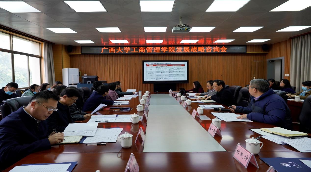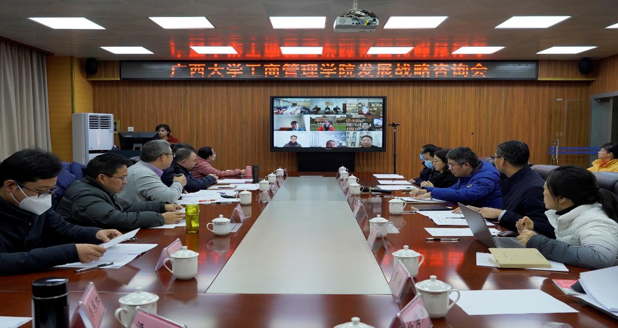 为了更好地推进新成立的工商管理学院学科发展,促力学院制定并实施好“十四五”规划,2月23日、25日,我院在学院315会议室以线上和线下的形式召开学院发展战略研讨会。南京大学工程管理学院名誉院长、原东南大学副校长盛昭瀚,首都经济贸易大学副校长王永贵教授,北京理工大学管理与经济学院院长王兆华教授,南开大学商学院原院长张玉利,中山大学管理学院原书记谭劲松,北京师范大学教授陈彬,中山大学旅游学院教授张朝枝等专家领导应邀在线上指导;广西壮族自治区政府发展研究中心党组书记、主任杨丛,百色学院党委书记唐拥军,广西教育学院党委书记、院长袁旭,广西电力职业技术学院校长李向红,广西财经学院副校长夏国恩,广西壮族自治区教育厅科研管理处处长黄青云,广西大学党委常委、统战部部长、广西大学行健文理学院院长曾冬梅,广西壮族自治区党委宣传部理论处副处长(主持工作)李意等专家领导应邀到会指导。