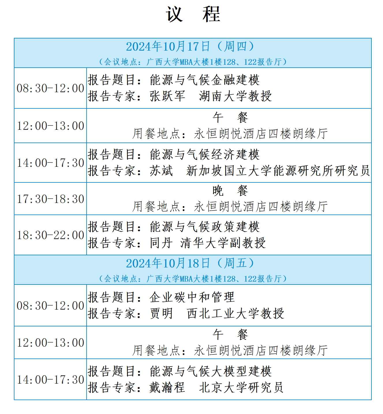 1.10月17日8:10,请参会代表在永恒朗悦酒店一楼大厅集合,由会务人员带队前往广西大学MBA大楼128报告厅(步行5分钟)。本次会议凭代表证出入校园,请妥善保管。