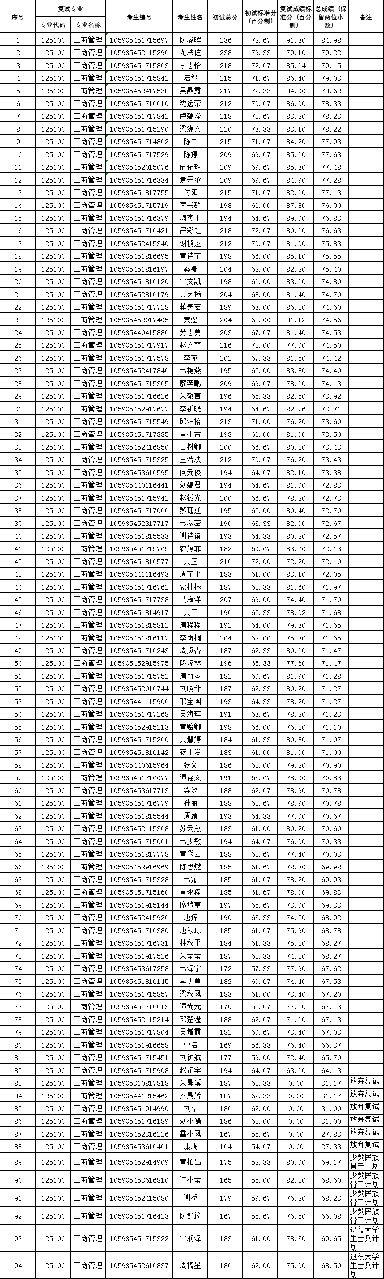 广西大学工商管理学院2025年工商管理硕士(非全日制MBA02方向)一志愿考生复试成绩公示如下。公示时间为2025年3月24日-2025年3月28日。公示期间,如有异议,请联系工商管理学院MBA教育中心反映,电话:0771-3299887。