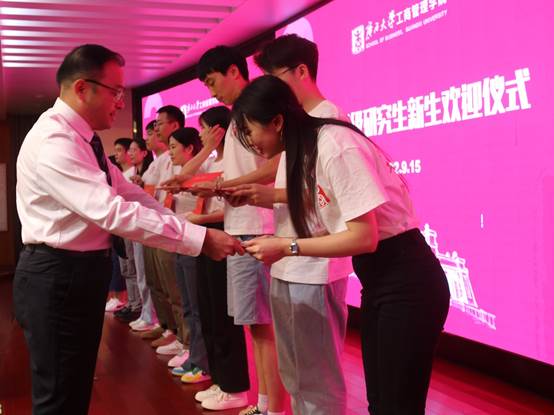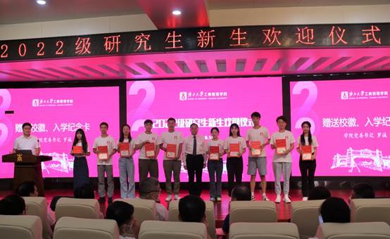 紧接着,学院党委书记罗诚为新生代表佩戴校徽和发放入学纪念卡,欢迎新同学成为工商管理学院大家庭的一份子。