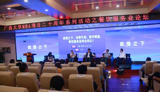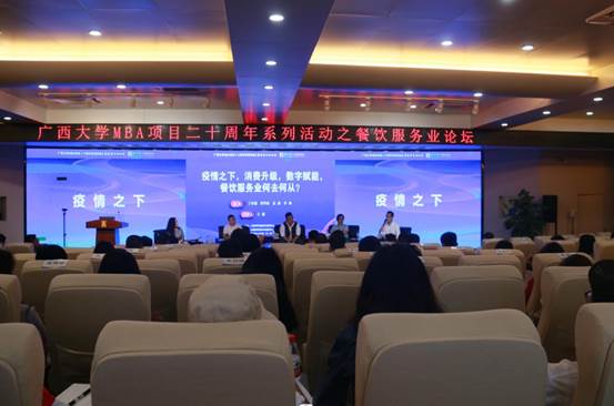 2022年11月5日下午,由广西大学工商管理学院研究生管理中心、MBA教育中心主办的以“疫情之下,消费升级,数字赋能,餐饮服务业何去何从”为主题的广西大学MBA项目二十周年系列活动之餐饮服务业论坛在工商管理学院128报告厅成功召开。