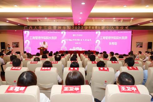 王萍主任代表全国工商管理专业学位研究生教育指导委员会秘书处、中国学位与研究生教育学会工商管理工作委员会诚挚地欢迎同学们加入MBA的大家庭。她简要介绍了我国MBA教育的发展情况,希望大家夯实系统商科知识、开拓管理创新思维、全面提升自身的管理能力和决策能力,成为广西地区、西南片区乃至全国经济社会发展的领军力量。