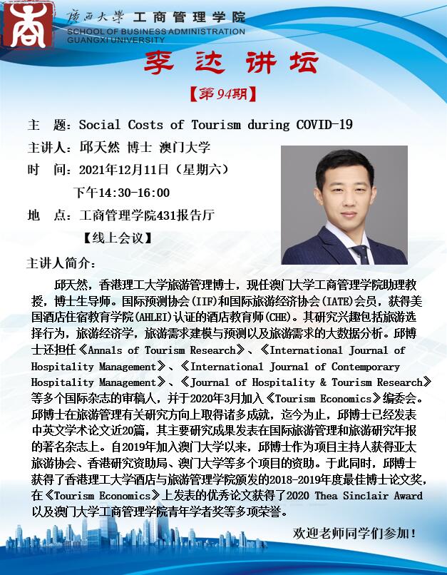 工商管理学院“李达讲坛”【第94期】:Social Costs of Tourism during COVID-19
