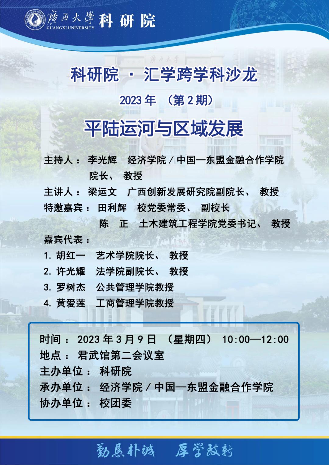 研讨内容: 河流,历来被史学家称为人类文明的摇篮。平陆运河是我国自京杭大运河后一千多年来的第一条运河,以发展航运为主,兼顾供水、灌溉、防洪、改善水生态环境等。平陆运河位于广西壮族自治区,是西部陆海新通道骨干工程,项目起于南宁市横州市西津库区平塘江口,经钦州市灵山县陆屋镇沿钦江进入北部湾,全长约 135 公里,按内河Ⅰ级航道标准建设,可通航 5000 吨级船舶。平陆运河对于推动广西及西南地区的经济社会发展具有重大的战略意义。运河建成通航后,将直接开辟广西内陆及中国西南、西北地区运距最短、最经济、最便捷的出海通道,并通过铁水联运,减轻长江通航压力,远期与正在研究论证的湘桂运河衔接,纵向贯通长江、珠江及北部湾,更好服务西南、中南地区向南入海直达东盟。平陆运河将打通广西开放发展的“任督二脉”,带动西部陆海新通道沿线资源优势加速转化为经济发展优势,优化区域发展战略布局,推动区域经济平衡协调发展,促进新时代西部大开发形成新格局。在这样的背景下,深入研讨平陆运河建设对经济社会的影响,恰逢其时。