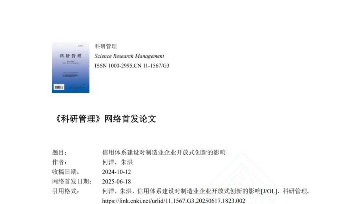 近日,我院助理教授何洋、硕士研究生朱洪在信用制度建设与企业开放式创新领域研究取得新进展,研究成果《信用体系建设对制造业企业开放式创新的影响》在创新管理领域高水平期刊《科研管理》上网络首发。我院助理教授何洋为第一和通讯作者,广西大学工商管理学院为第一单位。