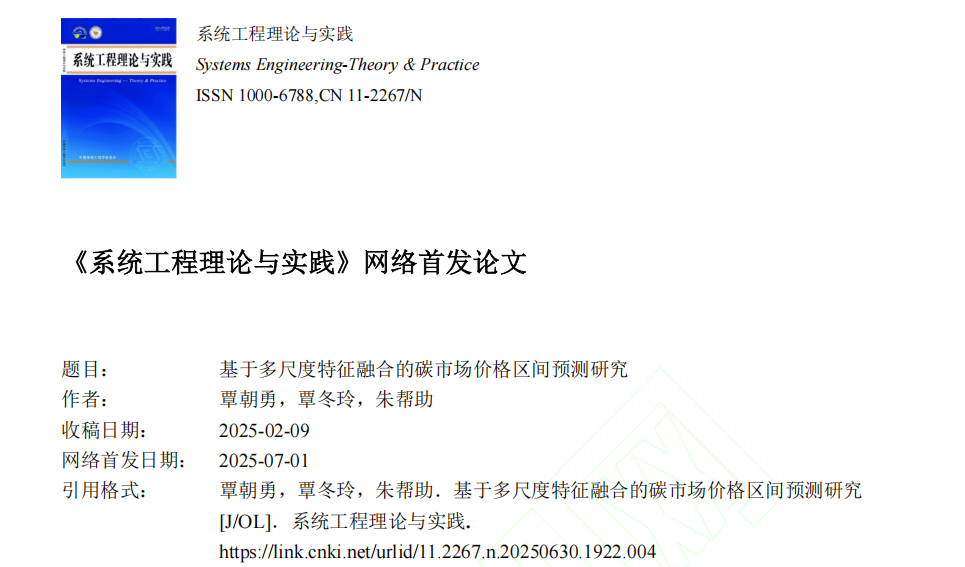 近日,我院覃朝勇教授团队在能源预测领域研究取得重要进展,研究成果《基于多尺度特征融合的碳市场价格区间预测研究》在管理科学与系统工程领域的顶级权威期刊《系统工程理论与实践》上发表。论文第一作者为覃朝勇教授,第二作者为我院硕士研究生覃冬玲,通讯作者为朱帮助教授。广西大学工商管理学院为第一单位和通讯单位。