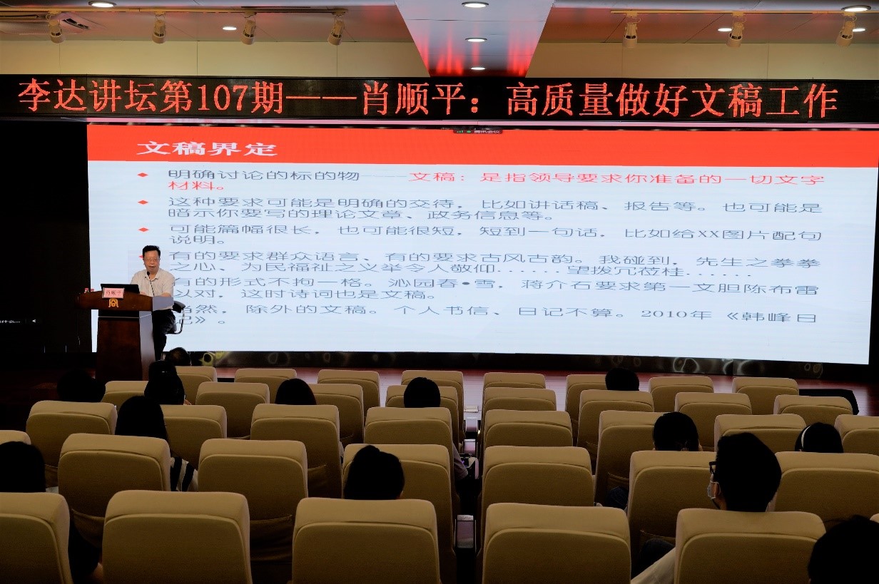 随后,肖顺平主任在学院128报告厅为师生们带来题为“高质量做好文稿工作”的专题讲座,工商管理学院副院长刘民坤教授主持。