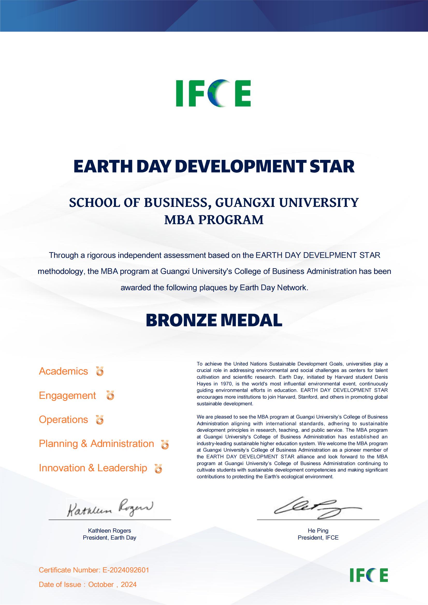 2024年10月我院MBA项目获得EARTH DAY DEVELOPMENT STAR铜牌认证,表明该项目在ESG和可持续发展领域得到了国际认可。